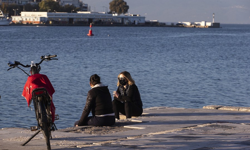 Two women chat in Halkida, a seaside town nearly 80 kilometers northeast of Athens, Greece, on Feb. 6, 2021. (Photo: Xinhua)