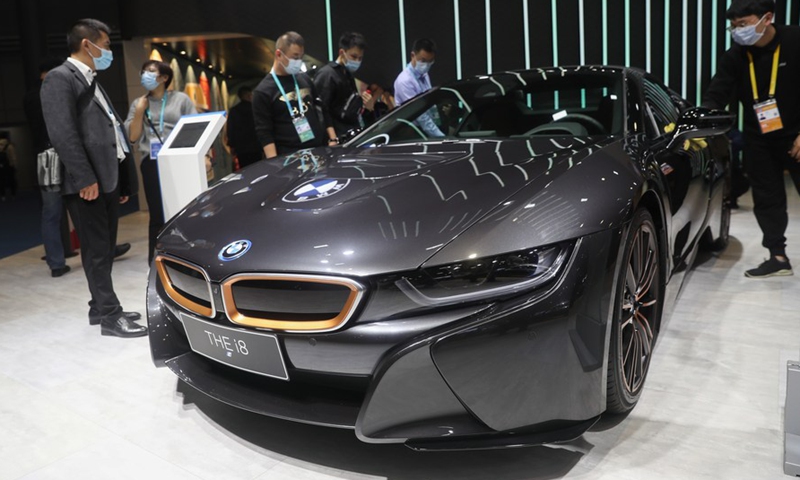 A BMW i8 car attracts visitors at the Automobile exhibition area during the third China International Import Expo (CIIE) in Shanghai, east China, Nov. 6, 2020.(Photo: Xinhua)