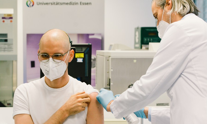 A medical worker (L) receives a COVID-19 vaccine at the university hospital of Essen in Essen, Germany, Jan. 18, 2021. (Photo: Xinhua)