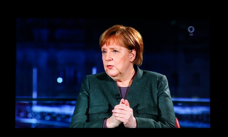German Chancellor Angela Merkel is seen in a televised interview with the German public broadcast ARD in Berlin, Germany, Feb. 2, 2021.(Photo: Xinhua)