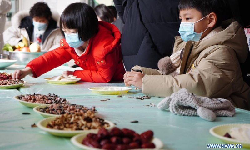 Kids make "dumplings" at the Qinghai-Tibet Plateau Wild Zoo in Xining, northwest China's Qinghai Province, Feb. 10. 2021. The Qinghai-Tibet Plateau Wild Zoo on Wednesday organized an activity with the Qinghai Environmental Education Association to prepare "special dumplings" made of nuts, fruits and vegetables for the zoo animals, so that children interacted with small animals to celebrate the upcoming Chinese Lunar New Year.(Photo: Xinhua)