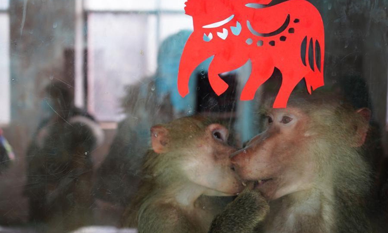 Two hamadryas baboons are seen at the Qinghai-Tibet Plateau Wild Zoo in Xining, northwest China's Qinghai Province, Feb. 10. 2021. The Qinghai-Tibet Plateau Wild Zoo on Wednesday organized an activity with the Qinghai Environmental Education Association to prepare "special dumplings" made of nuts, fruits and vegetables for the zoo animals, so that children interacted with small animals to celebrate the upcoming Chinese Lunar New Year.(Photo: Xinhua)