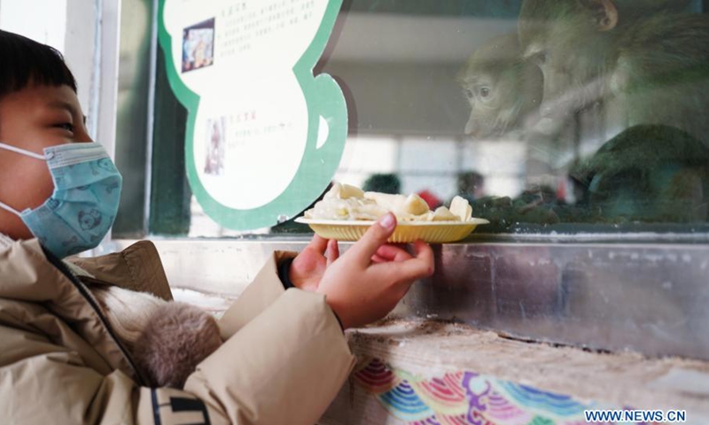 A kid shows the "dumplings" he made to animals at the Qinghai-Tibet Plateau Wild Zoo in Xining, northwest China's Qinghai Province, Feb. 10. 2021. The Qinghai-Tibet Plateau Wild Zoo on Wednesday organized an activity with the Qinghai Environmental Education Association to prepare "special dumplings" made of nuts, fruits and vegetables for the zoo animals, so that children interacted with small animals to celebrate the upcoming Chinese Lunar New Year.(Photo: Xinhua)