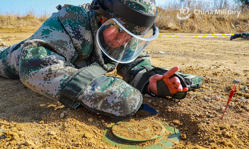 An Explosive Ordnance Disposal (EOD) soldier assigned to a barrier breaching company with a brigade under the PLA Navy Marine Corps demolishes a tilt-rod fuze, a device used to trigger anti-tank landmines, during a minesweeping training exercise in a minefield on January 29, 2021. (eng.chinamil.com.cn/Photo by Shang Wenbin)