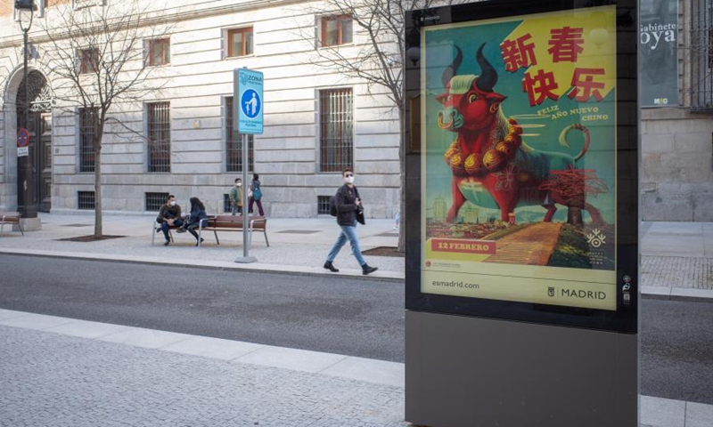 A poster themed on the Year of the Ox is pictured in Madrid, Spain, Feb. 10, 2021. (Xinhua/Meng Dingbo)