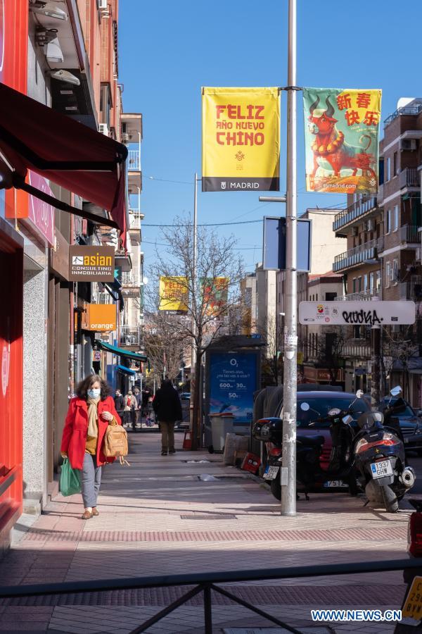 Street decorations celebrating Chinese lunar New Year is pictured in Madrid, Spain, Feb. 10, 2021. (Xinhua/Meng Dingbo)