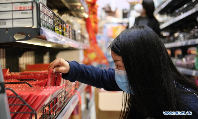 A woman purchases red packets at a supermarket in Madrid, Spain, Feb. 10, 2021. (Xinhua/Meng Dingbo)