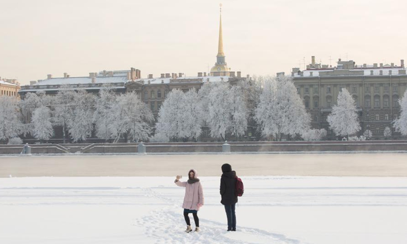 People take photos on the Neva River in St. Petersburg, Russia, Feb. 10, 2021. Local low temperature hit minus 23 degrees Celsius on Wednesday. (Photo by Irina Motina/Xinhua)