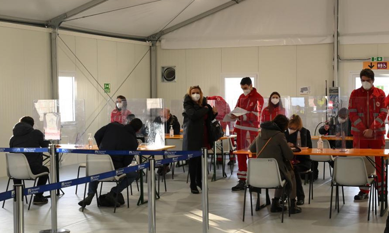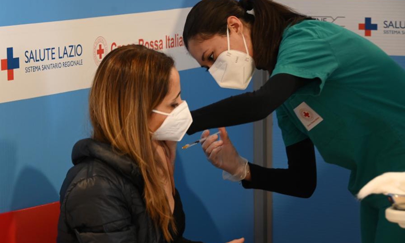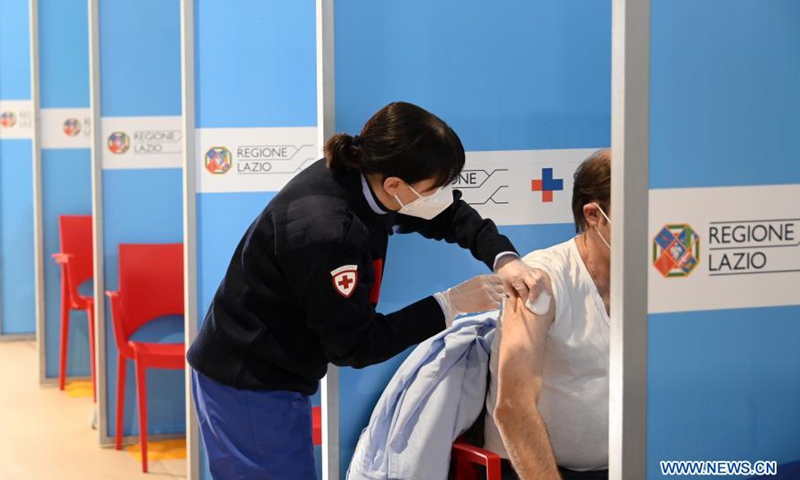 A medical worker receives the COVID-19 vaccine at a vaccination center at Rome's Fiumicino Airport, Italy, on Feb. 11, 2021. About one month after easing most restrictions on people's movements, Italy maintained a downward trend in active coronavirus infections, the latest official data showed.Photo:Xinhua