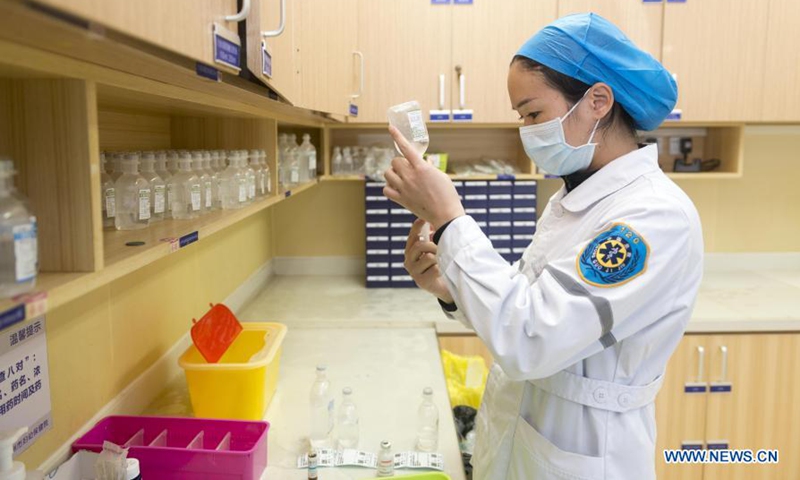 Medical worker Yang Hui works at Liuzhou Maternity and Child Healthcare Hospital in Liuzhou, south China's Guangxi Zhuang Autonomous Region, Feb. 11, 2021. People from various sectors stick to their posts on the eve of the Chinese Lunar New Year, or Spring Festival, which falls on Feb. 12. (Xinhua/Huang Xiaobang)