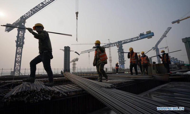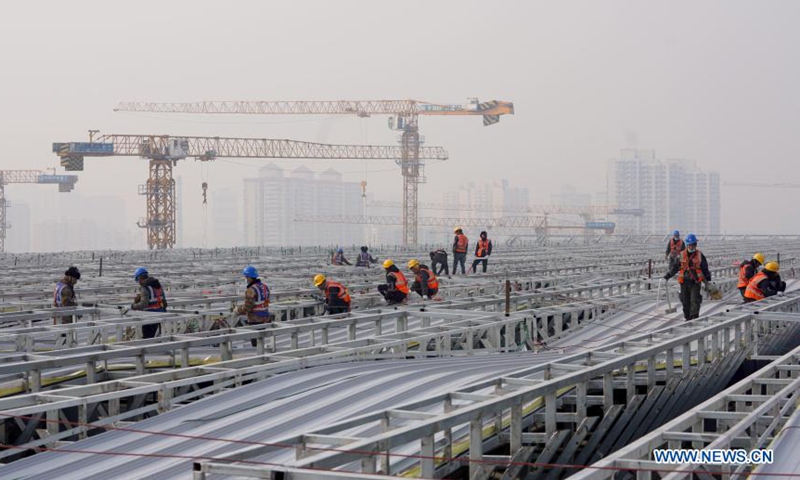 Workers work on a construction site at Fengtai Railway Station in Fengtai District of Beijing, capital of China, Feb. 11, 2021. People from various sectors stick to their posts on the eve of the Chinese Lunar New Year, or Spring Festival, which falls on Feb. 12. (Xinhua/Wang Yuguo)