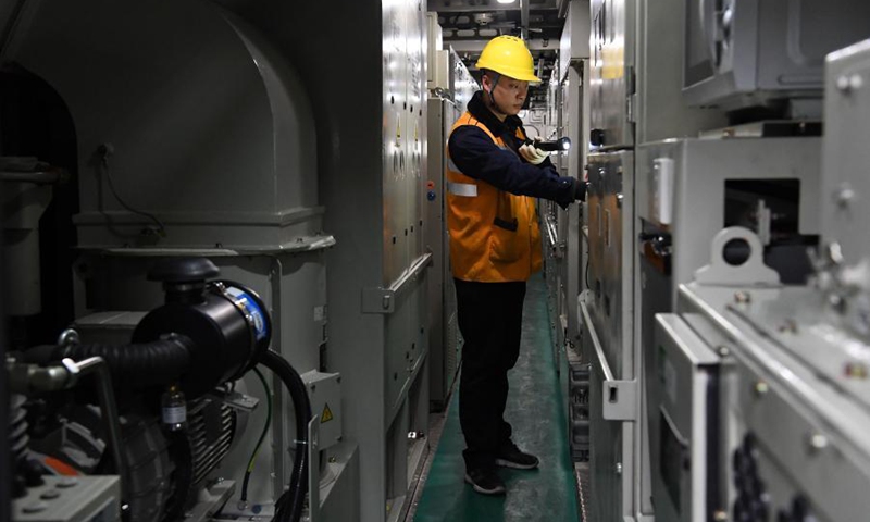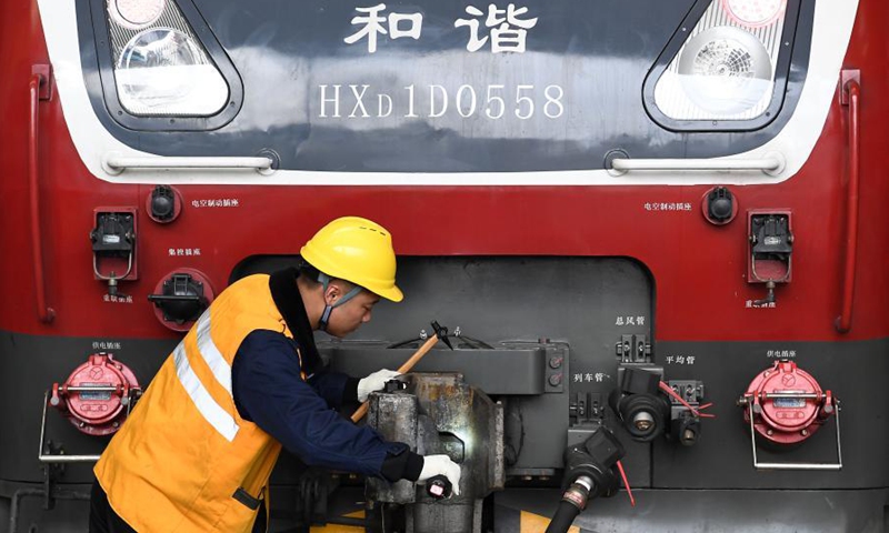 A staff member of China Railway Zhengzhou Bureau Group Co., Ltd. checks the wheels of a train in Zhengzhou, central China's Henan Province, Feb. 11, 2021. People from various sectors stick to their posts on the eve of the Chinese Lunar New Year, or Spring Festival, which falls on Feb. 12. (Xinhua/Li An)
