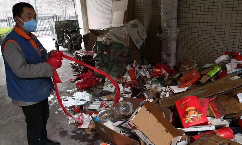 A sanitary worker recycles used plastic bottles and packaging boxes at a residential area in Beijing, capital of China, Feb. 11, 2021. People from various sectors stick to their posts on the eve of the Chinese Lunar New Year, or Spring Festival, which falls on Feb. 12. (Xinhua/Lan Hongguang)