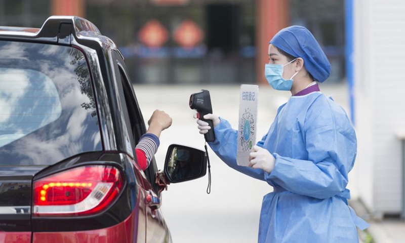 A medical worker measures the body temperature of a citizen in Liuzhou, south China's Guangxi Zhuang Autonomous Region, Feb. 11, 2021. People from various sectors stick to their posts on the eve of the Chinese Lunar New Year, or Spring Festival, which falls on Feb. 12. (Xinhua/Huang Xiaobang)