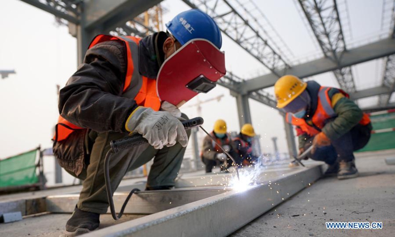 Workers conduct welding operation on a construction site at Fengtai Railway Station in Fengtai District of Beijing, capital of China, Feb. 11, 2021. People from various sectors stick to their posts on the eve of the Chinese Lunar New Year, or Spring Festival, which falls on Feb. 12. (Xinhua/Wang Yuguo)