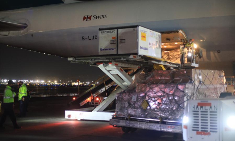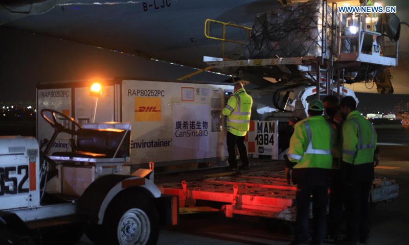 Staff members unload containers of the active substance needed to make a COVID-19 vaccine at the Mexico City International Airport in Mexico City, Mexico, Feb. 11, 2021. The first shipment of the active substance needed to make a COVID-19 vaccine developed by Chinese pharmaceutical firm CanSino Biologics arrived here on Thursday by air, Mexico's Foreign Affairs Ministry announced. (Xinhua)