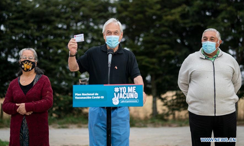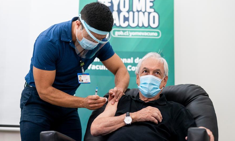 Chile's President Sebastian Pinera on Friday received the first dose of the CoronaVac vaccine developed by Chinese pharmaceutical firm Sinovac against the novel coronavirus disease, along with those aged 71 and over.