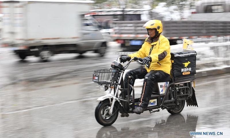 A food delivery man rides after snow in Xining, capital of northwest China's Qinghai Province, Nov. 4, 2018.File photo:Xinhua
