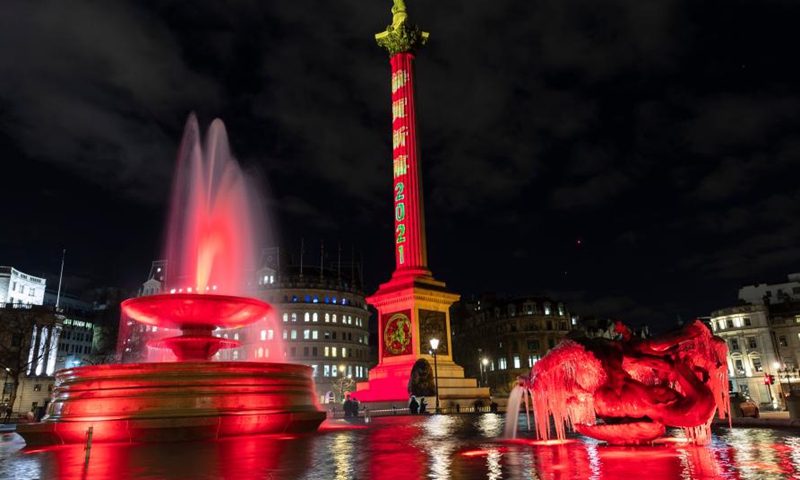 Photo taken on Feb 10, 2021 shows the Nelson's Column and fountains illuminated in red to celebrate the forthcoming Chinese Lunar New Year, the Year of the Ox, at Trafalgar Square in London, Britain.Photo:Xinhua