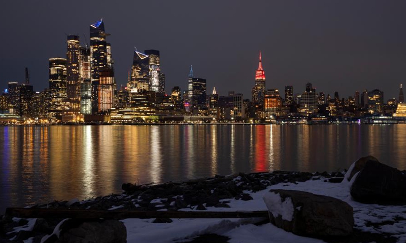 Photo taken on Feb. 10, 2021 shows the Empire State Building lit up in red for the Chinese Lunar New Year, in New York, the United States.Photo:Xinhua