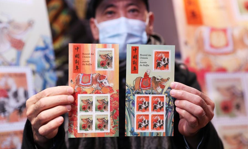 Paris-based Chinese artist Chen Jiang Hong displays the commemorative stamps themed on the Year of the Ox during the issuing ceremony in Paris, France, Feb. 6, 2021. Photo:Xinhua