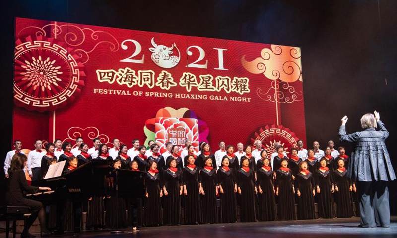 A chorus performs during the Festival of Spring Huaxing Gala Night held at SkyCity Theatre in Auckland, New Zealand, Feb. 7, 2021.Photo:Xinhua