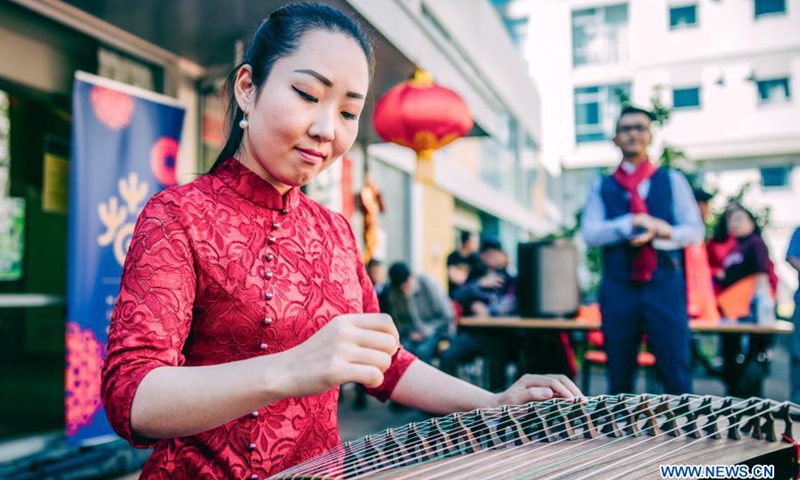 An artist from the China Cultural Center in Wellington performs Guzheng music for residents in Wellington's Central Park, New Zealand, Feb.13, 2021. The community celebration of the Chinese New Year was held in Wellington's Central Park, with Chinese music, traditions and blessings. (Photo by Zhang Jianyong/Xinhua)