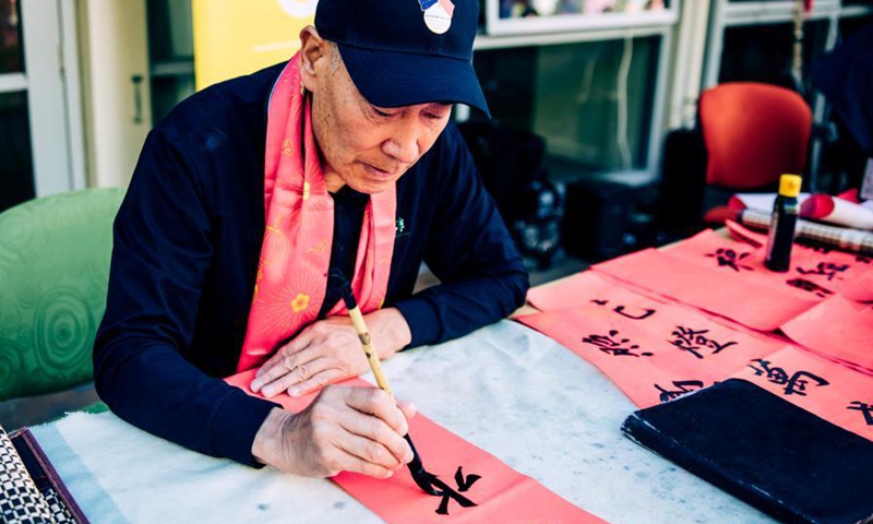 A calligrapher from a Chinese cultural group writes Spring couplets for residents in Wellington's Central Park, New Zealand, Feb.13, 2021. The community celebration of the Chinese New Year was held in Wellington's Central Park, with Chinese music, traditions and blessings. (Photo by Zhang Jianyong/Xinhua)