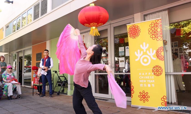 A woman performs Yangko Dance, a popular Chinese folk dance, for residents in Wellington's Central Park, New Zealand, Feb.13, 2021. The community celebration of the Chinese New Year was held in Wellington's Central Park, with Chinese music, traditions and blessings. (Photo by Zhang Jianyong/Xinhua)