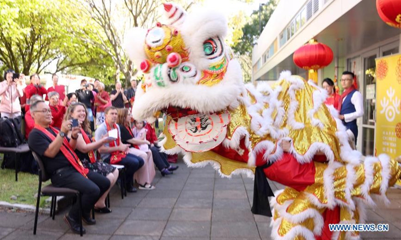 Lion dance is performed for residents in Wellington's Central Park, New Zealand, Feb.13, 2021. The community celebration of the Chinese New Year was held in Wellington's Central Park, with Chinese music, traditions and blessings. (Photo by Zhang Jianyong/Xinhua)