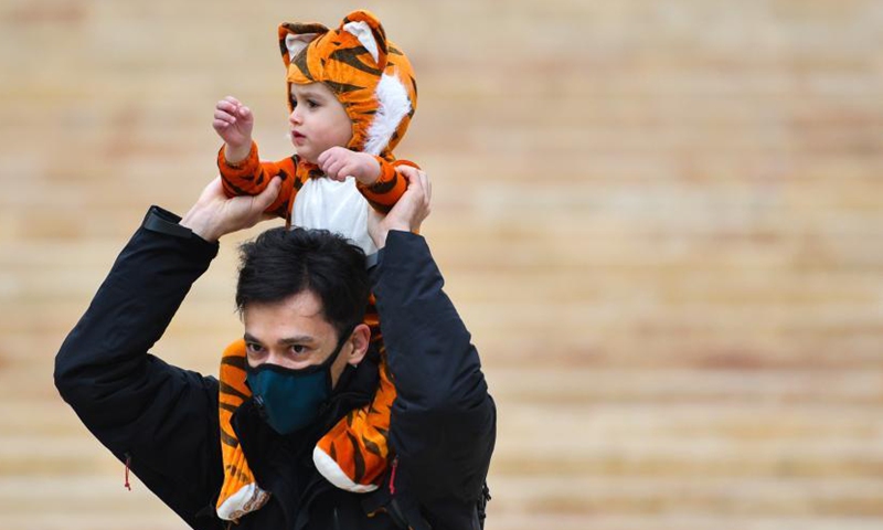 A man walks with a child dressed as a tiger sitting on his neck in Valletta, Malta, on Feb. 13, 2021. Maltese carnival enthusiasts do not let the COVID-19 pandemic dampen their passion for carnival as they still work on their colorful floats and exhibit them in a static art installation rather than a parade, in line with pandemic restrictions. (Photo by Jonathan Borg/Xinhua)