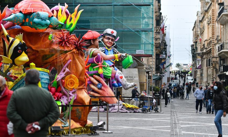 A carnival-themed installation is seen on a street in Valletta, Malta, on Feb. 13, 2021. Maltese carnival enthusiasts do not let the COVID-19 pandemic dampen their passion for carnival as they still work on their colorful floats and exhibit them in a static art installation rather than a parade, in line with pandemic restrictions. (Photo by Jonathan Borg/Xinhua)