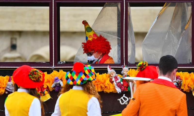 Actors perform during the carnival in Valletta, Malta, on Feb. 13, 2021. Maltese carnival enthusiasts do not let the COVID-19 pandemic dampen their passion for carnival as they still work on their colorful floats and exhibit them in a static art installation rather than a parade, in line with pandemic restrictions. (Photo by Jonathan Borg/Xinhua)