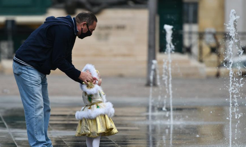 A man holds a girl dressed up for carnival to watch a fountain in Valletta, Malta, on Feb. 13, 2021. Maltese carnival enthusiasts do not let the COVID-19 pandemic dampen their passion for carnival as they still work on their colorful floats and exhibit them in a static art installation rather than a parade, in line with pandemic restrictions. (Photo by Jonathan Borg/Xinhua)