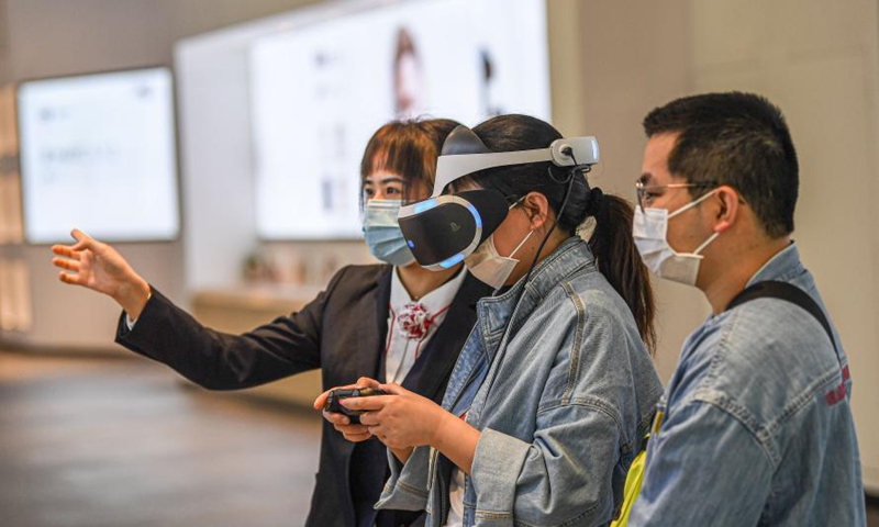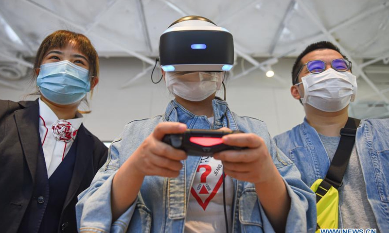 A consumer tries a gaming console during the Lunar New Year holiday at a duty-free shopping mall in Haikou, south China's Hainan Province, Feb. 14, 2021. (Xinhua/Pu Xiaoxu)