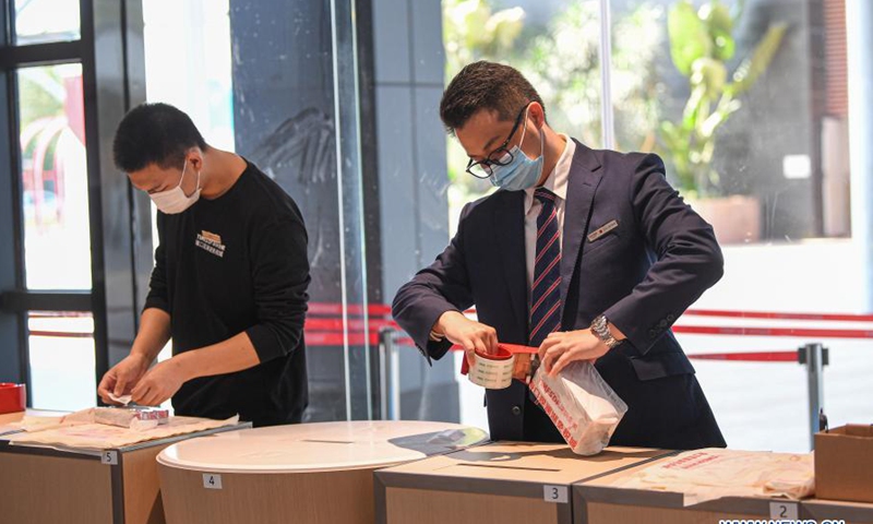 Staff members pack goods purchased by consumers during the Lunar New Year holiday at a duty-free shopping mall in Haikou, south China's Hainan Province, Feb. 14, 2021. (Xinhua/Pu Xiaoxu)
