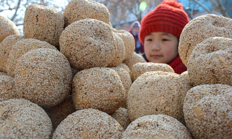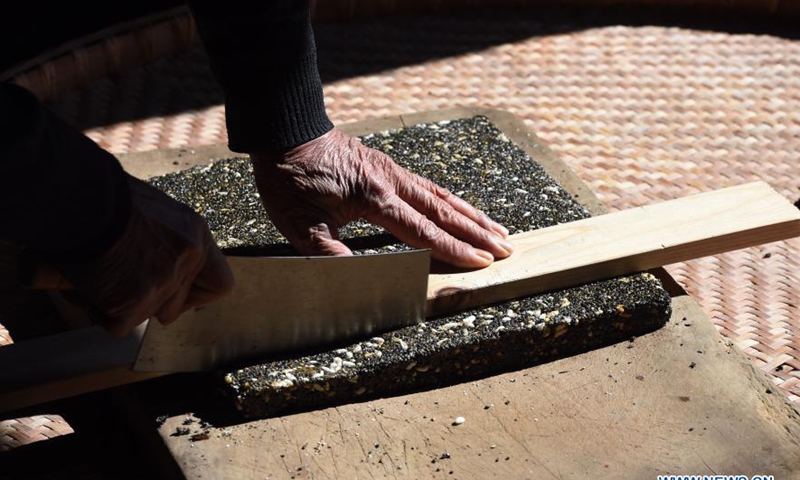 A villager makes sesame candies ahead of the Lunar New Year in Jingxian County, Xuancheng, east China's Anhui Province, Feb. 6, 2021. Lunar New Year ranks among the most important festivals in China, and the celebrations are multifaceted, including food. When the Lunar New Year comes, people across China make a variety of snacks which they believe will bring good fortune. (Xinhua/Zhou Mu)