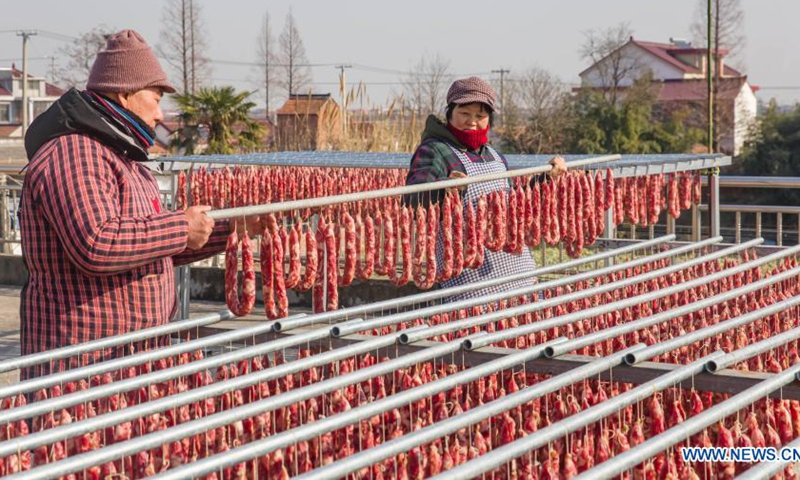 Villagers air-dry Lunar New Year sausages in Dagong Township, Hai'an City, Nantong, east China's Jiangsu Province, Jan. 10, 2021. Lunar New Year ranks among the most important festivals in China, and the celebrations are multifaceted, including food. When the Lunar New Year comes, people across China make a variety of snacks which they believe will bring good fortune. (Photo by Xiang Zhonglin/Xinhua)