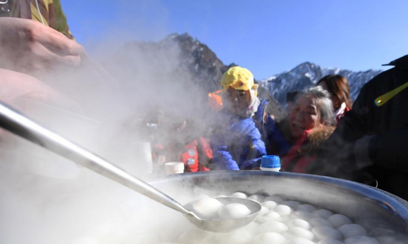 Tourists wait to be served with Yuanxiao, boiled glutinous rice flour balls typically consumed at the end of the Lunar New Year holiday, at Tianshan Tianchi National Park in northwest China's Xinjiang Uygur Autonomous Region, Feb. 17, 2021. Lunar New Year ranks among the most important festivals in China, and the celebrations are multifaceted, including food. When the Lunar New Year comes, people across China make a variety of snacks which they believe will bring good fortune. (Xinhua/Sadat)