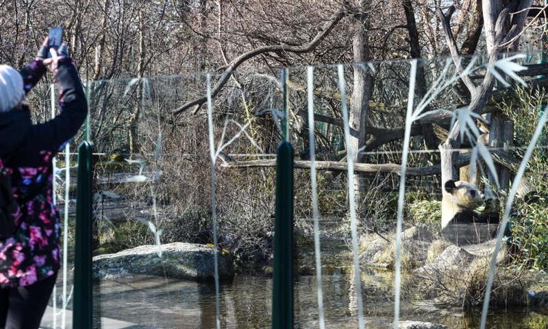 A visitor takes photo of Yang Yang, a giant panda from China, in Schonbrunn Zoo, Vienna, Austria, on Feb. 14, 2021. Animals at the Schonbrunn Zoo meet tourists in the first weekend after Austria relaxed it's third COVID-19 lockdown. Schonbrunn Zoo is one of the oldest zoos in Europe which is home to many animals including pandas from China. (Xinhua/Guo Chen)