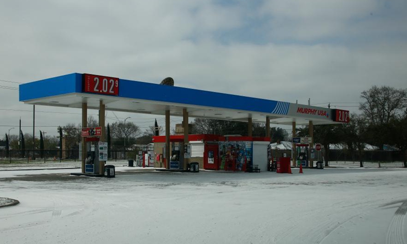 A gas station is closed due to power outage in Houston, Texas, the United States, on Feb. 15, 2021. Up to 2.5 million customers were without power in the U.S. state of Texas Monday morning as the state's power generation capacity is impacted by an ongoing winter storm brought by Arctic blast. (Photo by Chengyue Lao/Xinhua)