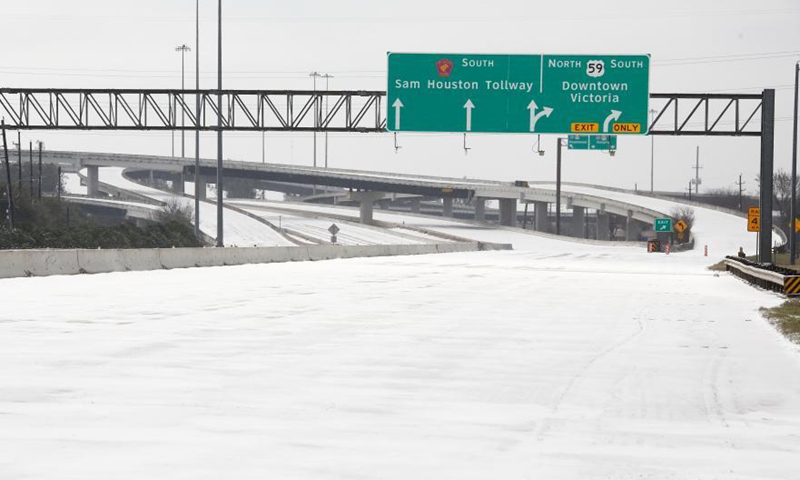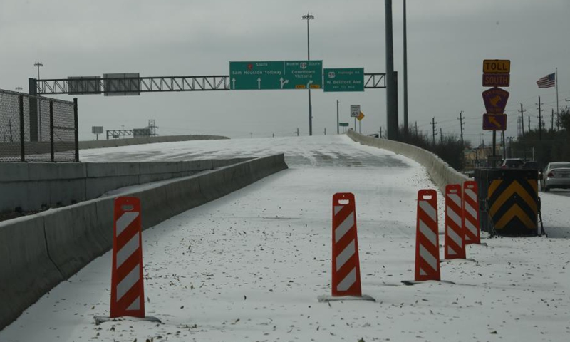 A highway is closed due to snow and ice in Houston, Texas, the United States, on Feb. 15, 2021. Up to 2.5 million customers were without power in the U.S. state of Texas Monday morning as the state's power generation capacity is impacted by an ongoing winter storm brought by Arctic blast. (Photo by Chengyue Lao/Xinhua)