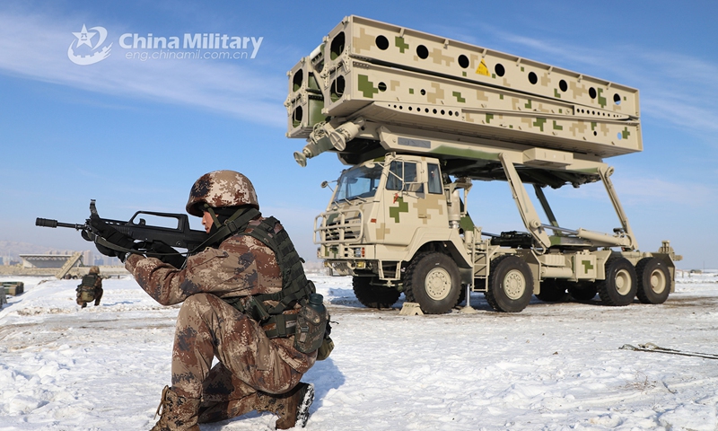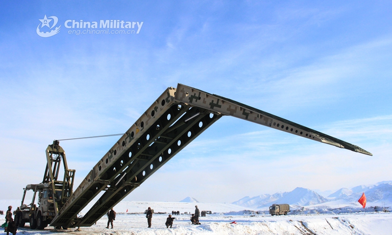 Soldiers assigned to an engineer regiment under the PLA Xinjiang Military Command deploy the Rapidly Emplaced Bridge System (REBS) during a bridge-building training exercise at the foot of the Tianshan Mountains on February 3, 2021. The vehicle-mounted REB is 23-meter long. Under the extreme cold conditions of minus 18 degrees Celsius, it took only 10 minutes for the troops to complete the bridging operation. (eng.chinamil.com.cn/Photo by Li Zhiqiang)