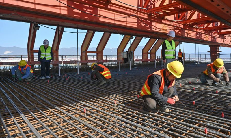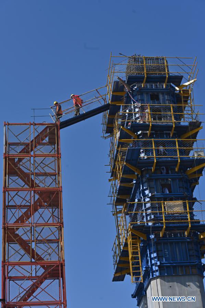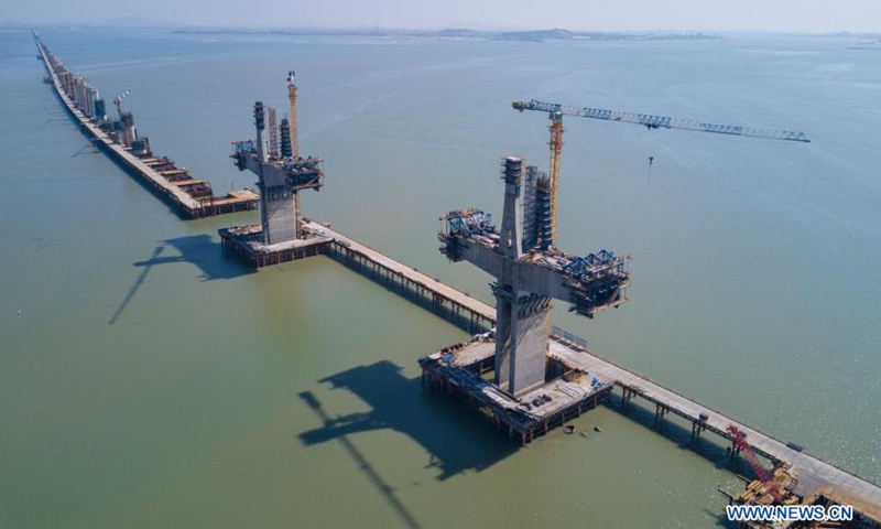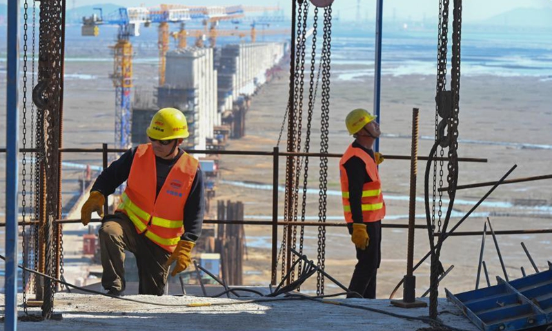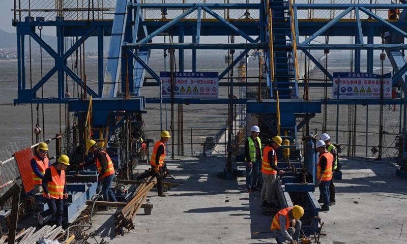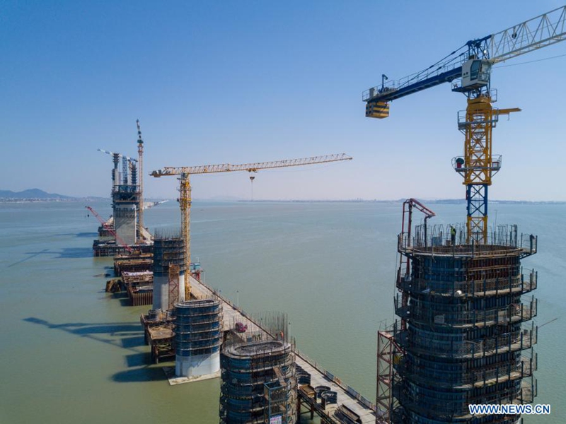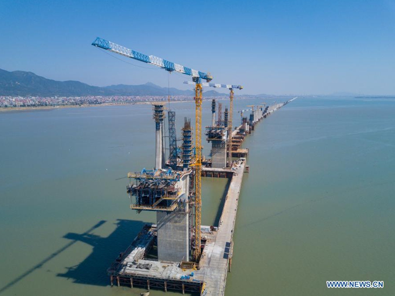 Laborers work at the construction site of Meizhou Bay cross-sea bridge of the Fuzhou-Xiamen high-speed railway in southeast China's Fujian Province, Feb. 15, 2021. Some 500 laborers still work at the construction site of the bridge during the Chinese Lunar New Year. The 14.7-km-long bridge is part of the province's Fuzhou-Xiamen high-speed railway, the first cross-sea high-speed railway in China, which is expected to be put into operation in 2022. (Xinhua/Song Weiwei)