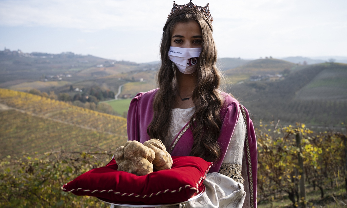 An hostess poses with a white truffle in Alba, northern Italy, on November 8, 2020. Photo: AFP