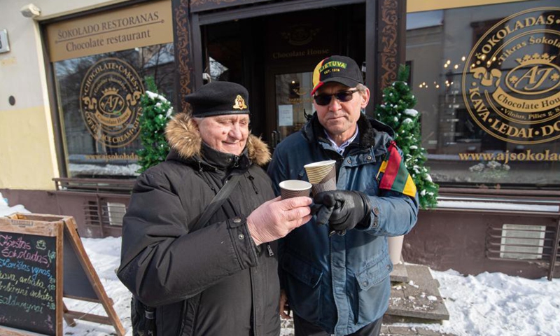 Two men celebrate the 103rd independence anniversary of Lithuania in the Old Town of Vilnius, Lithuania, Feb. 16, 2021. (Photo by Alfredas Pliadis/Xinhua)