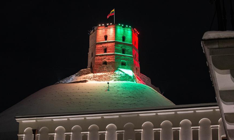 Gediminas' tower is illuminated in colors of the Lithuanian national flag to mark the 103rd independence anniversary of Lithuania in Vilnius, Lithuania, Feb. 16, 2021. (Photo by Alfredas Pliadis/Xinhua)