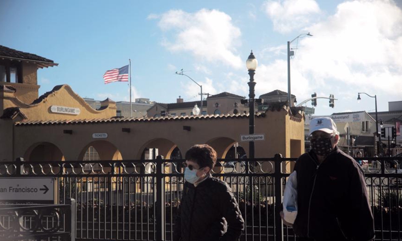 People walk on a crossing near the railway station in Burlingame, California, the United States, Feb. 16, 2021. The San Mateo County, where the Burlingame locates, is still in the strictest control, or purple tier. (Xinhua/Wu Xiaoling)