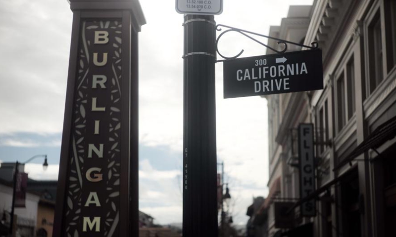 A business street is seen in Burlingame, California, the United States, Feb. 16, 2021. The San Mateo County, where the Burlingame locates, is still in the strictest control, or purple tier. (Xinhua/Wu Xiaoling)