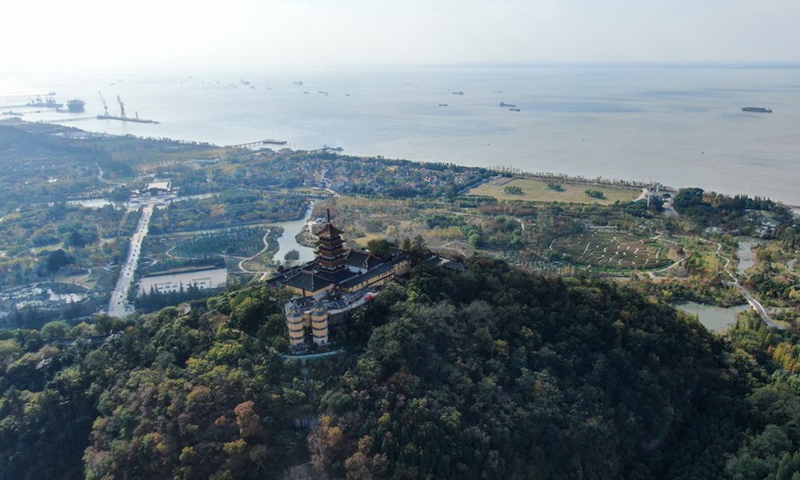 Aerial photo taken on Nov. 13, 2020 shows the scenery of Langshan Mountain along the Yangtze River in Nantong City, east China's Jiangsu Province.(Xinhua/Ji Chunpeng)